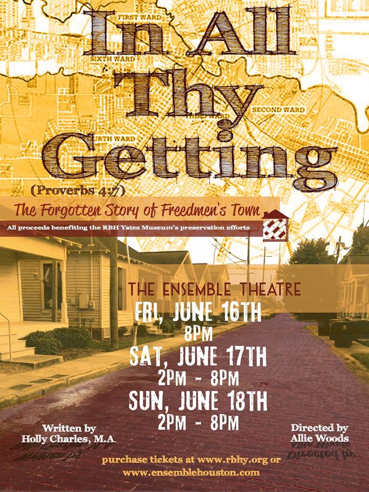 Holly Charles is the author of Velvet (initially written as her English Creative Thesis as Velvet: the Burden of Melanin and Motherhood). Her latest literary effort, a play entitled In All Thy Getting: The Forgotten Story of Freedmen’s Town, is a joint venture between the arts community and the Rutherford B.H. Yates Museum, purposed with raising awareness and funds towards the conservation of Houston 4th Ward’s rich African American History.